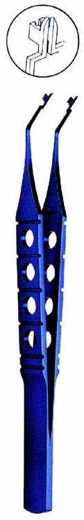 Incorporates tying platform tips for tucking the haptics into folded 6mm IOL. Handle stop pin prevents over folding IOL. 115mm long.