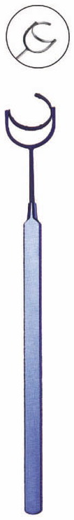 Offset 13mm diameter ring with 9mm cut out to accomodate the flap hinge. Swivel head, blunt teeth on both sides for stabilizing either the right or left eye during LASIK.