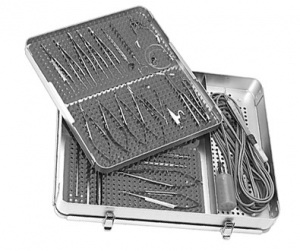 anodized aluminum double level, with a side compartment for larger items. Includes removable tray and 4 silicone mats. Base, lid, tray and mats are perforated for steam penetration. Outside dimensions: 123/4� x 101/2� x 15/8� (325 x 265 x 42mm) Accommodates 35 to 50 microsurgical instruments.
