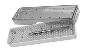 autoclavable plastic with silicone mat base, lid and mat are perforated for steam penetration. outside dimensions: 75/8� x 21/4� x 1� (195 x 60 x 25mm) For protecting microsurgical instruments during sterilization and storage, such as the �squeeze handle� vitrectomy instruments shown in this catalog.