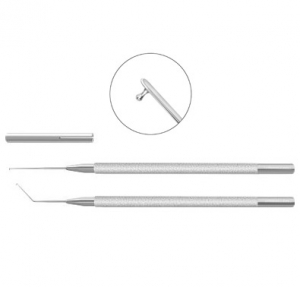 Lens Manipulating Hook round handle, 0.2mm diameter blunt tip straight, with guard angled