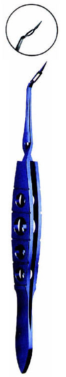Conventional smooth sharp pointed tips, 12mm angled curved shafts, cross-action, tip open to 3.0mm, flat handle, 120mm long.