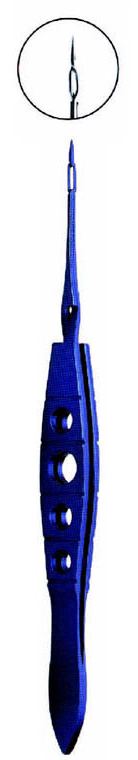 Conventional smooth sharp pointed tips. Straight shafts, cross-action, tip open to 3.0mm. Flat handle, 120mm long