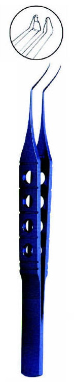 Bloomberg notched capsulorhexis forceps, 45deg angled tips with curved 12mm shafts, flat handle, with an iris stop, 85mm long