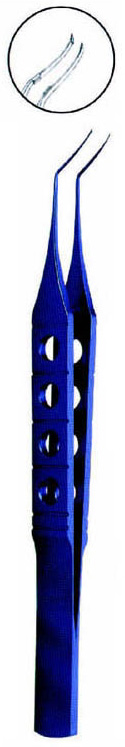 Corydon style capsulorhexis forceps, fine 45deg angled sharp tips with curved 12mm shafts for performing capsulorhexis through tunnel incision. Iris stop to prevent inadvertent iris capture. Cystotome teeth can be used to create initial flap in anterior capsule for single instrument capsulorhexis procedure. Flat handle, 115mm long