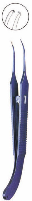 For fixating and retracting the globe during strabismus procedures. 1 x 2teeth, 0.5mm , thumb activated catch for locking. The instrument features a unique, weighted, curved handle for stabilizing the forceps after affixing it to the globe. A suture may be placed though a hole in the end of the handle and attached to the drape for additional traction, 118mm long