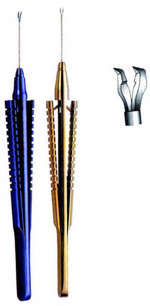 20G, a selection of forceps tip are available for Vitreo-Retinal procedures as well as anterior segment surgeries such as sphincterotomy, iridectomy and capsulorhexis. Capsulorhexis forceps, 2.5mm jaws, 0.7mm platforms. Straight.
