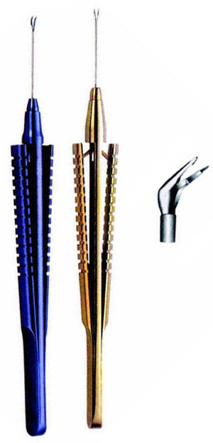 20G, a selection of forceps tip are available for Vitreo-Retinal procedures as well as anterior segment surgeries such as sphincterotomy, iridectomy and capsulorhexis. Membrane peeler, grooved, angled 45deg, squeeze handle.