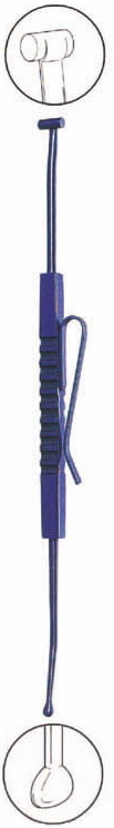 Double-end depressor and marker, round end designed for depressing sclera and curved marking end for reaching behind the Globe. 6mm wide bar and 2.5mm tear drop shape tips.