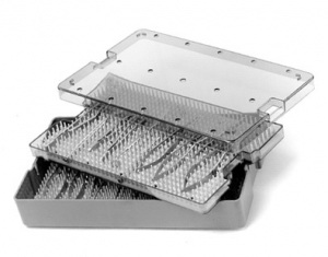 autoclavable plastic case, includes removable tray and two silicone mats. Base, lid, tray and mats are perforated for steam penetration. Outside dimensions: 103/8� x 63/8� x 17/8� (265 x 160 x 50mm) Accommodates 20 to 25 microsurgical instruments