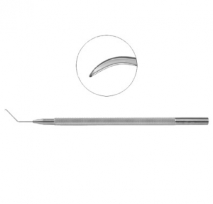Scimitar Prechopper curved tip with blunt end and sharp inferior edge.