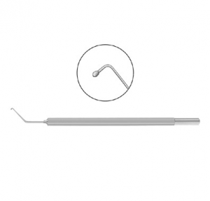 delicate olive tip Olive-shaped tip is used to gently depress the cornea to locate the flap edge. Once located, the smooth polished tip can be used to engage the edge then slide it around the rim to partially open the flap.