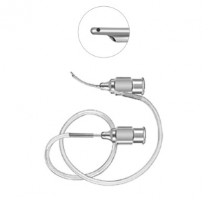 Irrigating–Aspirating Cannula 15mm long 0.3mm diameter aspiration port front opening irrigation port 23 gauge thin wall For aspiration through luer-lock hub and irrigation through tubing hub