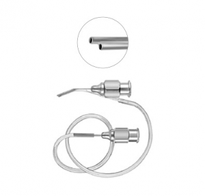 Irrigating–Aspirating Cannula U-shaped, 0.3mm anterior aspiration port 23 gauge Supplied with silicone tubing and adaptor. For aspiration through tubing hub and irrigation through luer-lock hub. curved right curved left 23 gauge